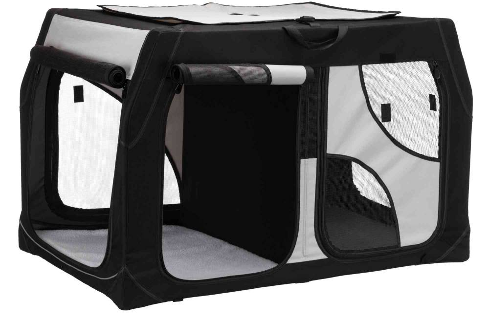 Vario Mobiilne Topelt Kennel stabiilne metallkarkass, lukustuv avatav kolmelt küljelt ülemise võrgusilma saab katta välistaskutega kasti all olev konks ja kinnitus takistab selle libisemist saab kasutada ka õues koos põhjaklappide ja pulkadega lambanaha välimusega lamamismatt (polüester) valmistatud vastupidavast polüestrist värv: must / hall