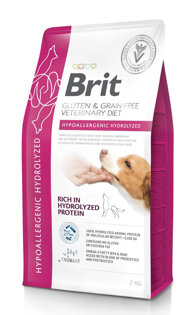 Brit Hypoallergenic Hydrolyzed täisdieettoit koertele – vähendab koostisainete ja toitainete talumatust, toetab naha funktsiooni dermatoosi ja liigse karvakaotuse korral.