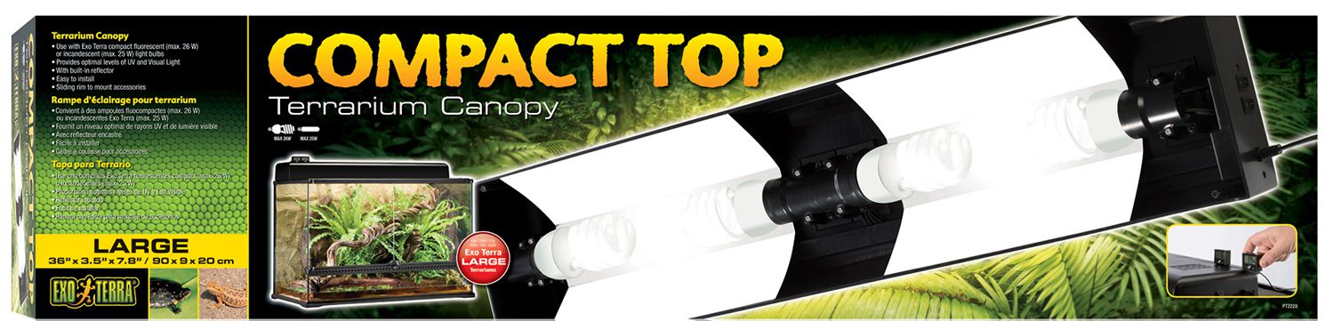 Exo Terra Compact Top Canopy ei ole lihtsalt valgusti; see on keskne osa täiusliku keskkonna loomisel teie roomajate või kahepaiksete jaoks. See täpselt disainitud valgusti sobib ideaalselt Exo Terra Natural Terraariumile ja Screen Terraariumile. Selle võime mahutada mitu kompaktset luminofoorlampi ja LED-pirni võimaldab teil kohandada valgustusstsenaariume erinevate lampide abil, jäljendades autentsemat looduskeskkonda.