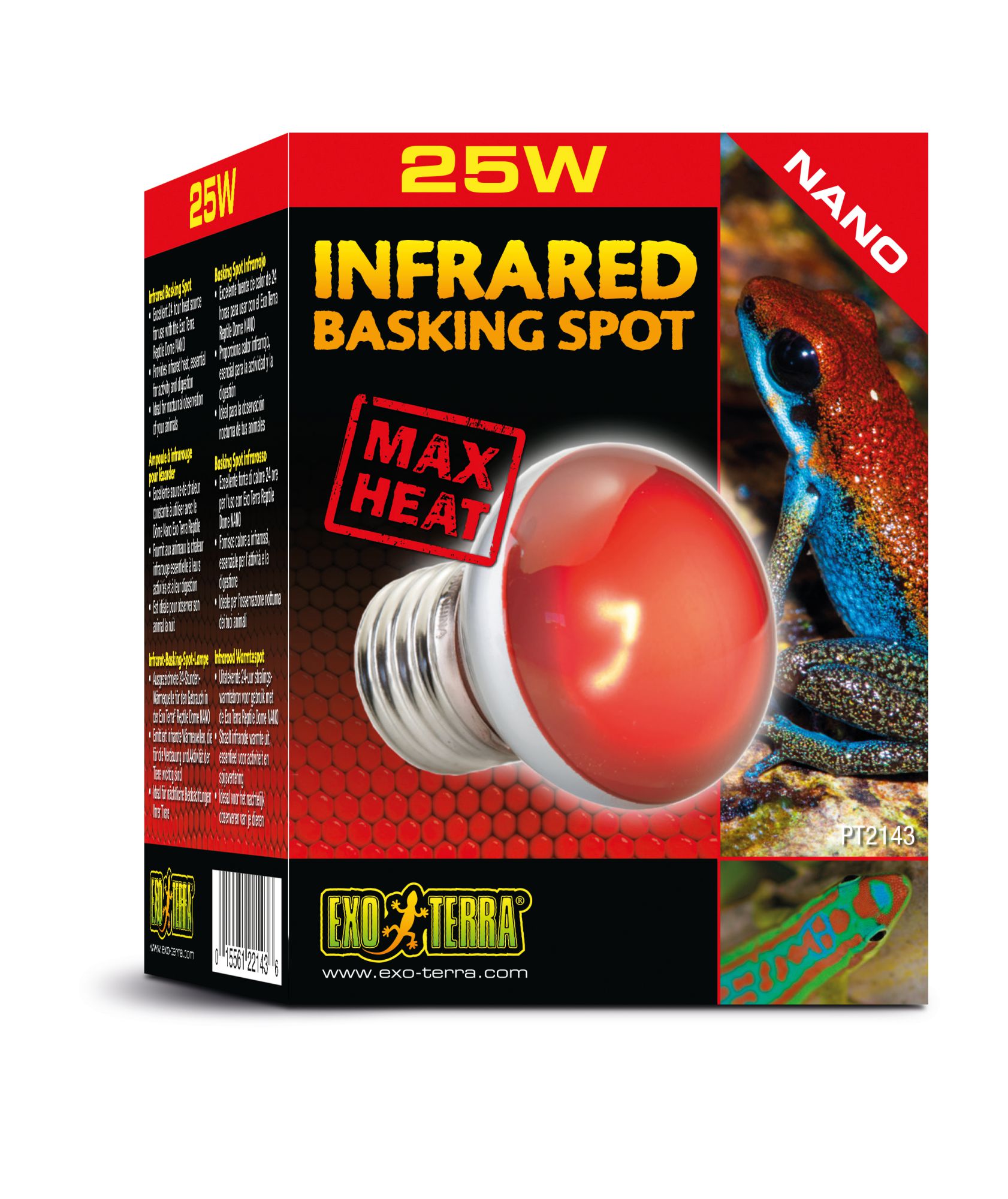 Spetsiaalselt roomajate soojenduspaiga valgustamiseks ja soojedamiseks loodud infrapuna elektripirn. Võimaldab suunata kitsas kiir täpselt ühele paigale, seega luues nn basking paiga. Punane klaas edastab spetsiaalse niidi poolt kiirgatud infrapuna laineid. Punakas valgus ei sega roomajate normaalset käitumist nii päeval, kui öösel, tänu millele see on suurepärane ööpäevaringne soojuse allikas.- tõstab üldist õhutemperatuuri terraariumis- tagab soojust, mis on oluline aktiivsuse ja seedimise jaoks- kiiritab infrapuna sooja laineid- suurepärane kiirgav ööpäevaringne soojuse allikas- ei sega loomuliku aktiivsuse tsüklit- ideaalne öövaatluse jaoks- sobib ühendamiseks Repti Glo või Sun Glo lampidega 24-tunnise valgustustsükli loomiseks- sobib valgustiga Exo Terra Glow Light (PT2052 / PT2054 / PT2056) Võimsus: 25W
